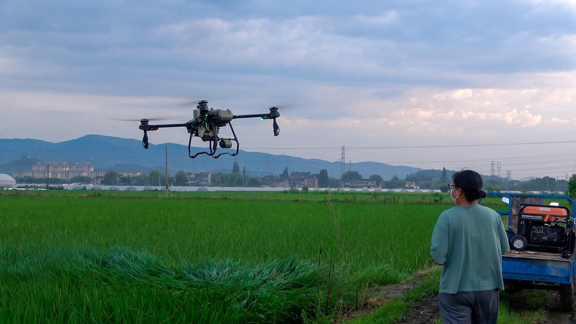 农户使用无人机对水稻进行病虫害防治作业(袁佳颖 摄)