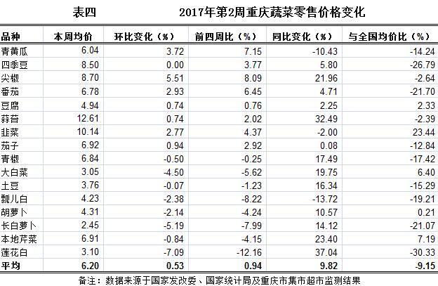 据与国家发改委和国家统计局共有的16个品种蔬菜零售价格的监测数据对比,第2周重庆蔬菜零售价格环比与上周持平,与前四周比均价上浮0.94%,同比上涨9.82%,低于全国同期同品种综合零售均价9.15%(详见表四)。