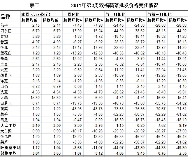 双福国际农贸城蔬菜批发市场大宗品种加权均价、算数均价分别为3.10元/公斤、3.50元/公斤,环比价格均表现略涨,与上月比均表现平稳,与前三月价格相比均表现上涨。所有品种加权均价、算数均价分别为3.04元/公斤、3.63元/公斤,环比价格分别表现平稳、小幅下跌,与上月比分别表现小幅下跌、下跌,与前三月价格相比分别表现平稳、略跌(详见表三)。