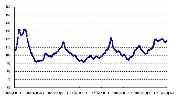 据农业农村部监测,2019年第19周(2019年5月6日- 5月12日,下同)“农产品批发价格200指数”为115.46(以2015年为100),比前一周升0.83个点;“‘菜篮子’产品批发价格200指数”为117.49(以2015年为100),比前一周升0.94个点。重点监测的50家批发市场60个品种交易总量为55.08万吨,比前一周增6.4%。