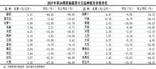 通过对我市最大的蔬菜批发市场--双福国际农贸城第24周(2021年06月14日-06月20日)43个品种蔬菜批发交易情况监测,环比表现:总批发量、大宗品种批发量均明显减少;总体算术批发价下跌、大宗品种算术批发价明显下跌;总交易车数减少。同比表现:总体批发量、大宗批发量均略减;总体算术批发价平稳、大宗品种算术批发价明显下跌;总交易车数同比明显增加。