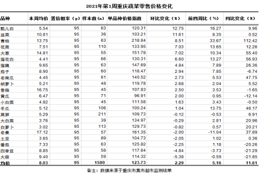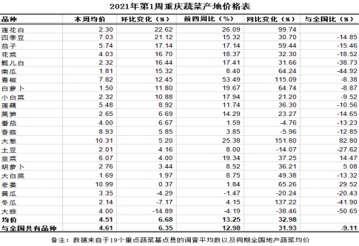 第1周(2021.01.04~2021.01.10)重庆市22个主要地产蔬菜监测品种均价4.51元(公斤价,以下无特别说明同),环比上涨6.68%,与前四周比明显上涨13.25%,同比陡升32.98%,低于全国均价9.11%。环比,17涨3跌2平稳。其中,上涨幅度较大的品种及价格变化:莲花白2.30元、四季豆7.03元,环比分别大幅上涨22.62%、21.12%;茄子5.74元、花菜4.03元、瓢儿白2.32元、老南瓜1.81元、青椒7.82元、白萝卜1.50元、小白菜2.32元,环比分别明显上涨17.14%、16.70%、16.44%、15.32%、12.45%、11.80%、10.88%。下跌幅度较大的品种及价格变化:大蒜4.00元,环比明显下跌14.89%。其余品种涨跌幅均在10.00%以内。