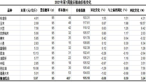 根据市农业信息中心对全市38个区县农贸市场12个主要粮油品种价格监测,第1周重庆粮油总体均价5.97元,类价格指数为105.18。环比,1涨2跌9平稳,总体下滑0.08%、表现平稳。