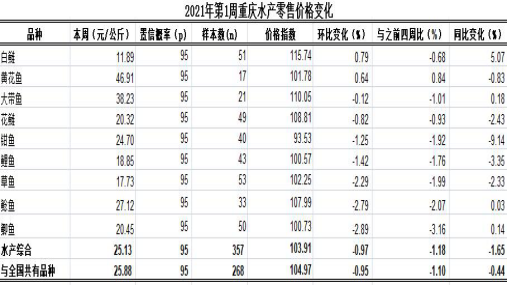 根据市农业信息中心对全市38个区县农贸市场9种主要水产品(除大带鱼、黄花鱼为冻鱼,其余品种均为活鱼)零售价格监测,第1周重庆水产总体零售均价25.13元,类价格指数为103.91。环比,5跌4平稳,总体下滑0.97%、表现平稳。