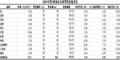 根据市农业信息中心对全市38个区县农贸市场11种大众、时令水果监测,第1周重庆水果总体零售均价8.73元,类价格指数105.93。环比,5涨2跌4平稳,总体上浮1.09%、表现平稳。