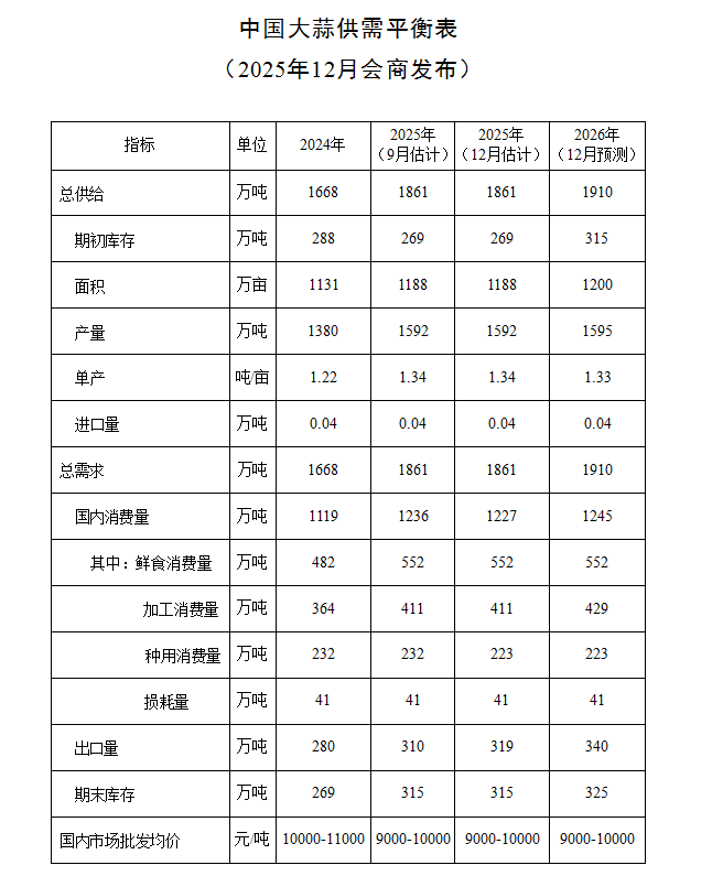 中国大蒜年度供需平衡表(2025年12月会商发布)