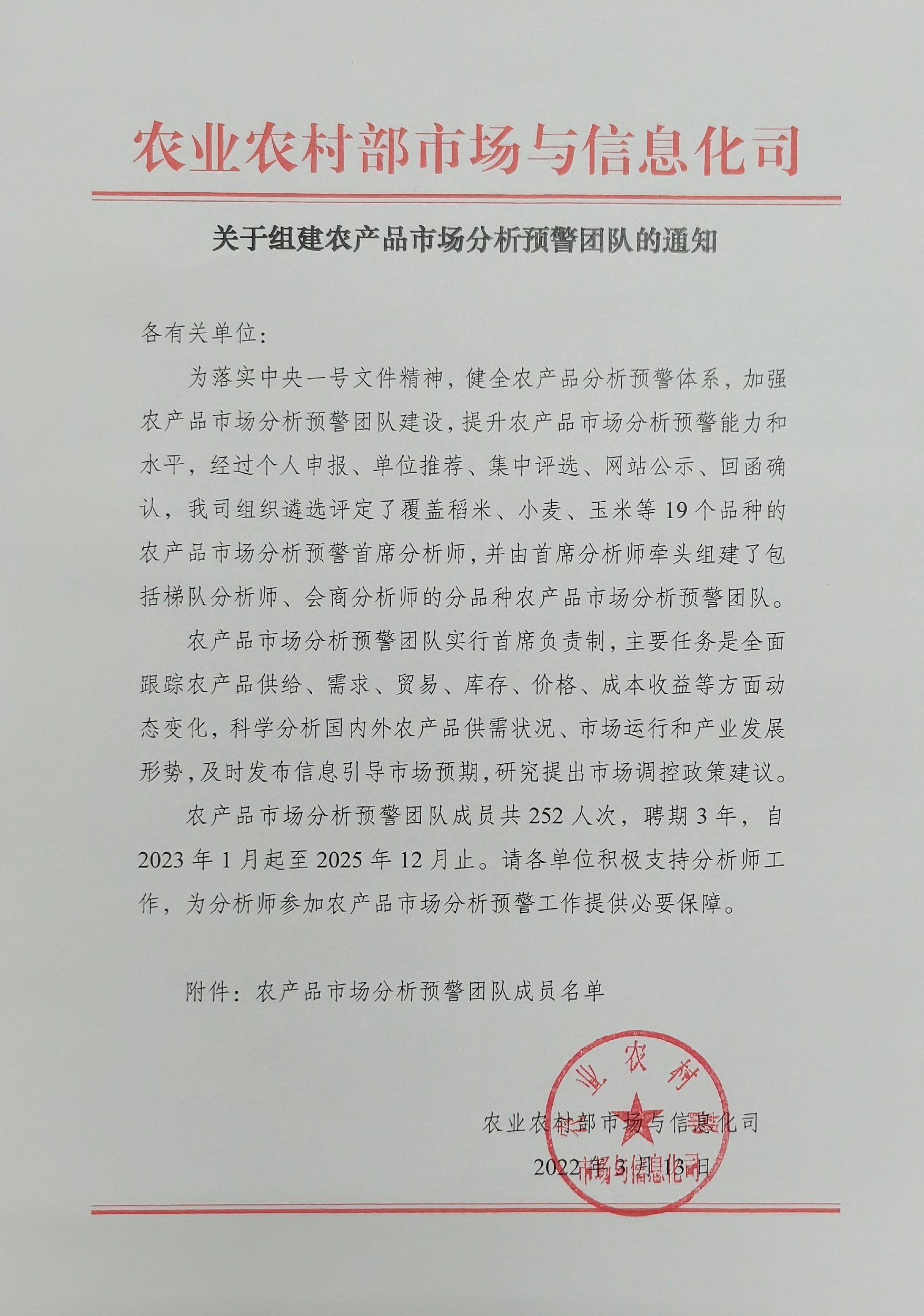 关于组建农产品市场分析预警团队的通知