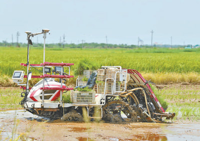 江西省南昌县蒋巷镇的稻田里,无人驾驶插秧机在栽种晚稻秧苗。