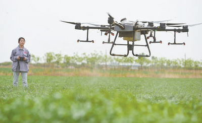 河北省沧县兴济镇赵庄子村,新型职业农民操控无人机为作物喷洒营养液。