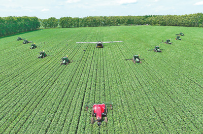 黑龙江省黑河市,北大荒集团北安分公司组织多台经过改装的智能农机,在无人驾驶状态下对作物进行中耕作业。