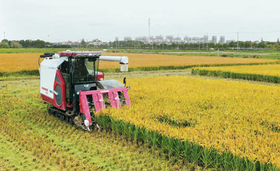 上海市浦东新区宣桥镇腰路村的稻田中,无人驾驶收割机在收割水稻。