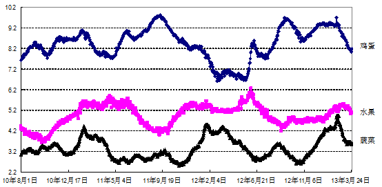 人民网3月21日题为《重庆:猪肉价格重回“个位”时代二季度或上涨》的报道说:重庆市部分猪肉价格每500克已经跌破10元大关。目前,各区县生猪收购价格普遍降至每公斤12.5元-13.5元区间,比春节前回落2成以上。据重庆市商委分析,年初,由于生猪价格上涨,养殖户惜售和观望,造成生猪压栏;春节后生猪集中出栏,造成价格跳水。《辽宁日报》3月21日题为《辽宁生猪价格持续走低》的报道说:辽宁省服务业委公布的对省内23家大型养猪场监测结果显示,2月份全省生猪平均出栏价为每公斤14.28元,环比跌14.64%,同比跌13.35%;据省内12家大型猪肉批发市场监测,2月份猪肉平均批发价格为每公斤22.02元,环比跌0.9%,同比跌5.37%。新华网3月20日题为《2月中旬以来全国鸡蛋价格下降近一成》的报道说:2月中旬以来全国鸡蛋价格快速回落,目前已创下2012年8月下旬以来最低水平。与2月10日相比,全国鸡蛋价格下降9.4%。分地区来看,逾九成省区市鸡蛋价格下降,天津、河北、山西、辽宁、黑龙江、山东的降幅居前,均超过15%。目前,山东、山西和河南的鸡蛋价格已降至每斤4元以下。