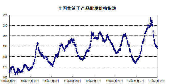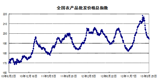 据农业部市场监测,今年第12周(2013年3月18日—3月24日,下同)“全国农产品批发价格指数”为195.68(以2000年为100),比前一周下降0.86个点;“全国菜篮子产品批发价格指数”为194.59(以2000年为100),比前一周下降0.95个点;重点监测的50家批发市场60个品种交易总量为57.40万吨,环比增加5.1%。