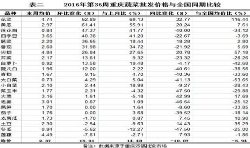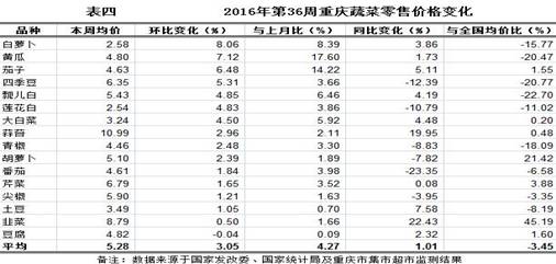 据与国家发改委和国家统计局共有的16个品种蔬菜零售价格的监测数据对比,第36周重庆蔬菜零售价格环比上浮3.05%,与上月比均价略涨4.27%,同比上浮1.01%,略低于全国同期同品种综合零售均价3.45%(详见表四)。