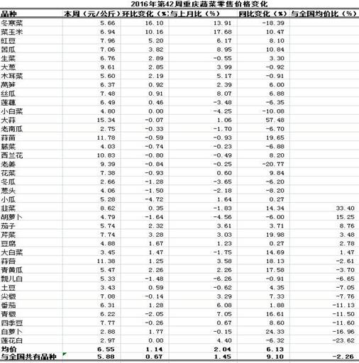 16个与国家发改委和国家统计局共有品种的监测数据对比,第42周重庆蔬菜零售价格5.88元/公斤,环比、之前四周均价比均平稳,同比上涨9.10%,略低于全国同期同品种综合零售均价2.26%。