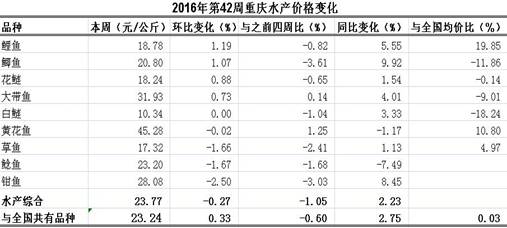 根据市农业信息中心对全市38个区县农贸市场9种主要水产品(除大带鱼、黄花鱼为冻鱼,其余品种均为活鱼)零售价格监测,第42周重庆水产总体零售均价23.77元/公斤。环比,2涨3跌4平稳,总体均价下滑0.27%,表现平稳;7个与全国共有品种总体均价与全国均价持平。