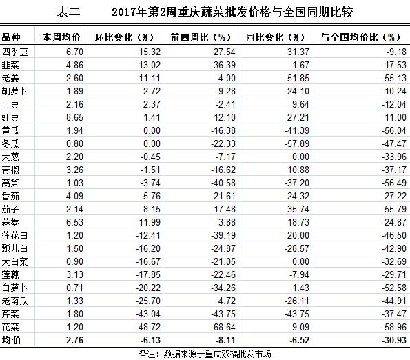 与全国同期、同品种监测结果比较,以双福国际农贸城蔬菜批发市场批发价格做分析,第2周重庆22个蔬菜品种平均算数批发价2.76元/公斤,环比下滑6.13%,表现下跌;与前四周比下滑8.11%,表现下跌;同比下滑6.52%,下跌;大幅低于全国同期同品种算数均价30.93%(详见表二)。