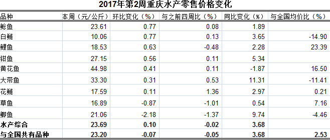 根据市农业信息中心对全市38个区县农贸市场9种主要水产品(除大带鱼、黄花鱼为冻鱼,其余品种均为活鱼)零售价格监测,第2周重庆水产总体零售均价23.69元/公斤。环比1跌8平稳,总体均价上浮0.10%,表现平稳;7个与全国共有品种总体均价小幅高于全国均价2.53%。