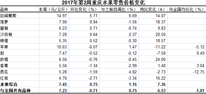 根据市农业信息中心对全市38个区县农贸市场11种大众、时令水果监测,第2周重庆水果总体零售均价7.45元/公斤。环比,1涨1跌9平稳,总体上浮0.75%,表现平稳;4个与全国共有监测品种总体零售均价与全国均价比2高2低,总体均价低于全国均价1.81%,表现持平。