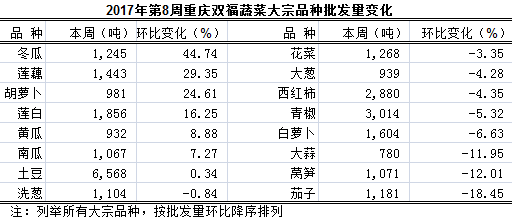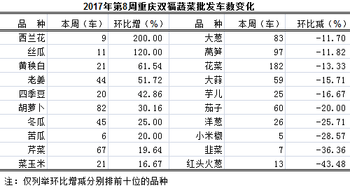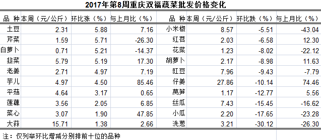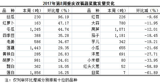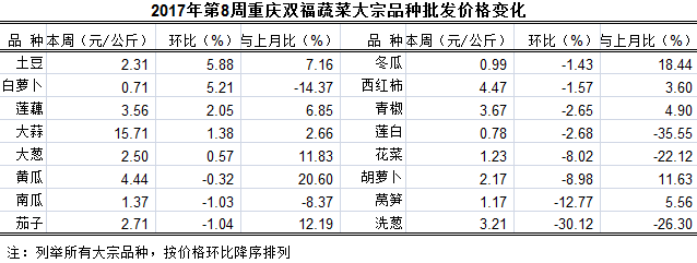 2017年第8周重庆双福国际农贸城蔬菜批发量环比平稳、批发价格环比略跌