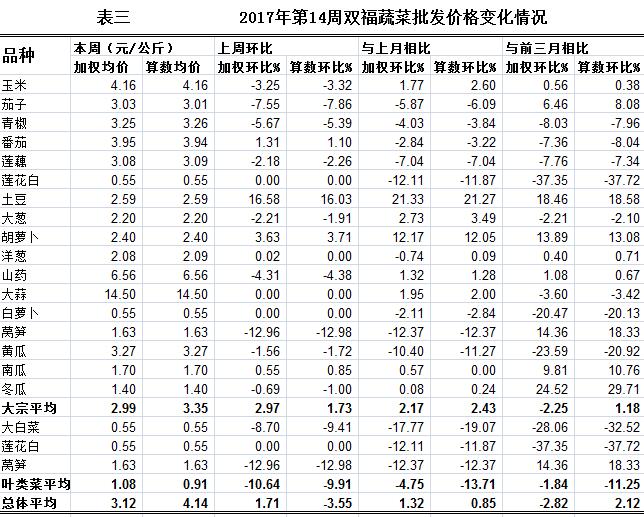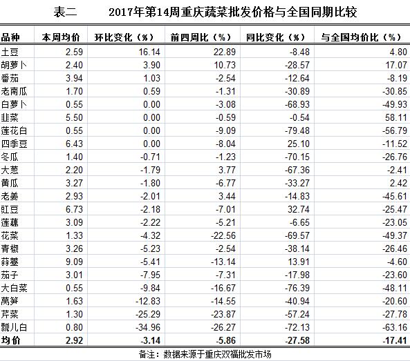 与全国同期、同品种监测结果比较,以双福国际农贸城蔬菜批发市场批发价格做分析,第14周重庆22个蔬菜品种平均算数批发价2.92元/公斤,环比下滑3.14%,表现略跌;与前四周比下滑5.86%,表现小幅下跌;同比下滑27.58%,表现大幅下跌;明显低于全国同期同品种算数均价17.41%(详见表二)。