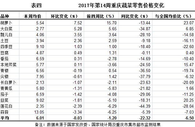 据与国家发改委和国家统计局共有的16个品种蔬菜零售价格的监测数据对比,第14周重庆蔬菜零售价格6.01元/公斤,环比表现下滑0.03%,与前四周比均价下跌1.20%,同比大幅下跌22.32%,低于全国同期同品种综合零售均价6.50%(详见表四)。