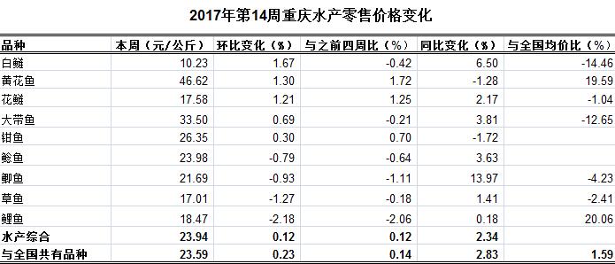 根据市农业信息中心对全市38个区县农贸市场9种主要水产品(除大带鱼、黄花鱼为冻鱼,其余品种均为活鱼)零售价格监测,第14周重庆水产总体零售均价23.94元/公斤。环比3涨2跌4平稳,总体均价上浮0.12%,表现平稳;7个与全国共有品种总体均价略高于全国均价1.59%。