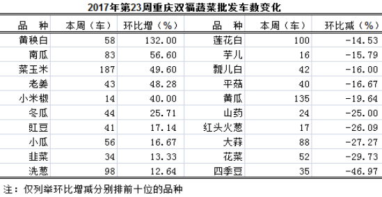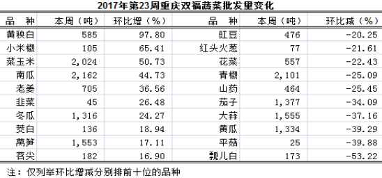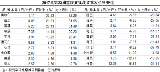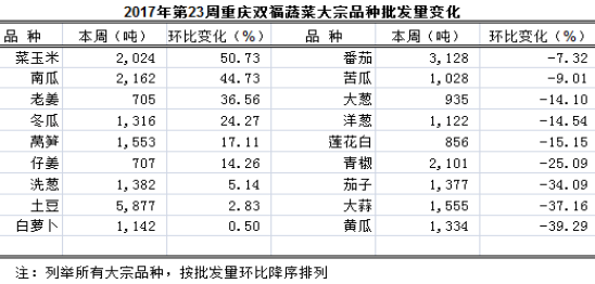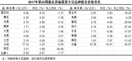 通过对我市最大的蔬菜批发市场--双福国际农贸城第23周(6月5日—6月11日)44个品种蔬菜批发交易情况监测,总体表现,与上一周比:批发总量小幅减少、大宗批发量减少;批发总体均价平稳、大宗品种均价明显上涨;总交易车数表现平稳;与上月比:蔬菜总体批发均价明显下跌、大宗品种均价平稳。