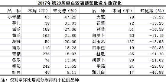 通过对我市最大的蔬菜批发市场--双福国际农贸城第29周(7月17日—7月23日)45个品种蔬菜批发交易情况监测,总体表现,与上一周比:批发总量、大宗批发量表现均平稳;总体算术批发均价、大宗品种算术均价均表现略涨;总交易车数表现平稳;与上月比:蔬菜总体算术批发均价表现上涨、大宗品种算术均价明显下跌。
