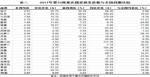 与全国同期、同品种监测结果比较,以双福国际农贸城蔬菜批发市场批发价格做分析,第33周重庆22个蔬菜品种平均算数批发价3.07元/公斤,环比上浮0.91%,表现平稳;与前四周比上浮3.53%,表现略涨;同比上浮30.65%,表现陡升;略低于全国同期同品种算数均价3.16%(详见表二)。