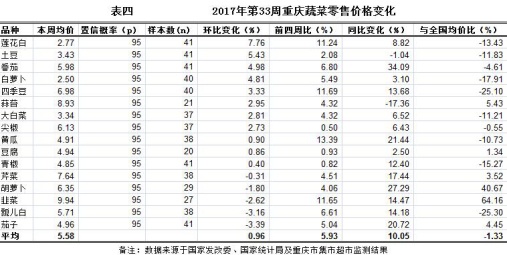 据与国家发改委和国家统计局共有的16个品种蔬菜零售价格的监测数据对比,第33周重庆蔬菜零售价格5.58元/公斤,环比上浮0.96%,表现平稳;与前四周比均价上浮5.93%,表现小幅上涨;同比上浮10.05%,表现明显上涨;低于全国同期同品种综合零售均价1.33%(详见表四)。