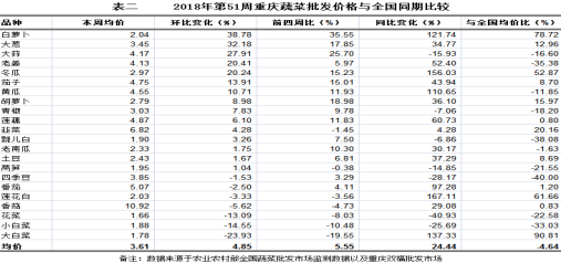 与全国同期、同品种监测结果比较,以双福国际农贸城蔬菜批发市场批发价格做分析,第51周重庆22个蔬菜品种算数平均批发价3.61元/公斤,环比小幅上涨4.85%;与前四周比小幅上涨5.55%;同比大幅上涨24.44%;小幅低于全国均价4.64%。分品种环比看,12涨4跌6平稳。具体表现,环比上涨幅度较大的品种及价格变化:白萝卜2.04元/公斤、大葱3.45元/公斤,环比分别上涨38.78%、32.18%,均表现陡升;大蒜4.17元/公斤、老姜4.13元/公斤、冬瓜2.97元/公斤,环比分别上涨27.91%、20.41%、20.24%,均表现大幅上涨;茄子4.75元/公斤、黄瓜4.55元/公斤,环比分别上涨13.91%、10.71%,均表现明显上涨。环比下跌幅度较大的品种及价格变化:大白菜1.78元/公斤,环比跌23.93%,表现大幅下跌;小白菜1.88元/公斤、花菜1.66元/公斤,环比分别跌14.55%、13.09%,均表现明显下跌。其余品种涨跌幅均在10.00%以内(详见表二)。