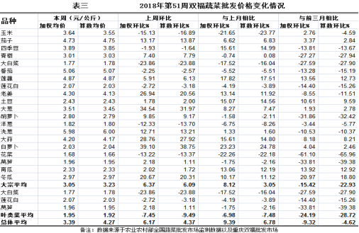 双福国际农贸城蔬菜批发市场大宗品种加权均价、算数均价分别为3.05元/公斤、3.23元/公斤,环比分别表现上涨6.37%、6.09%;与上月比分别表现上涨8.12%、略涨3.05%;与前三月比分别表现明显下跌15.42%、大幅下跌22.93%。所有品种加权均价、算数均价分别为3.39元/公斤、4.27元/公斤,环比分别表现上涨6.17%、小幅上涨4.37%;与上月比分别表现上涨9.39%、6.78%;与前三月比分别表现下跌9.32%、小幅下跌4.62%(详见表三)。