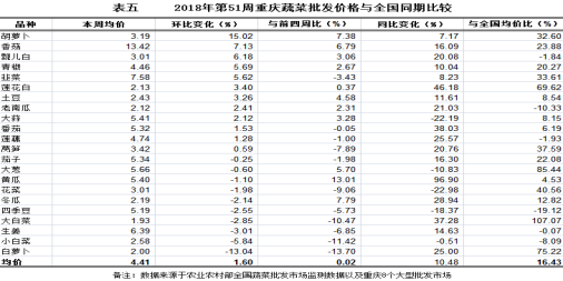 据全市8个大型批发市场监测数据,与全国同期、同品种监测结果比较,第51周重庆22个蔬菜品种算数平均批发价4.41元/公斤,环比上浮1.60%,表现平稳;与前四周比上浮0.02%,表现持平;同比明显上涨10.48%;明显高于全国同期同品种均价16.43%。分品种环比看,9涨6跌7平稳。具体表现,环比上涨的品种及价格变化:胡萝卜3.19元/公斤,环比涨15.02%,表现明显上涨。环比下跌的品种及价格变化:白萝卜2.00元/公斤,环比跌13.04%,表现明显下跌。其余品种涨跌幅均在10.00%以内(详见表五)。