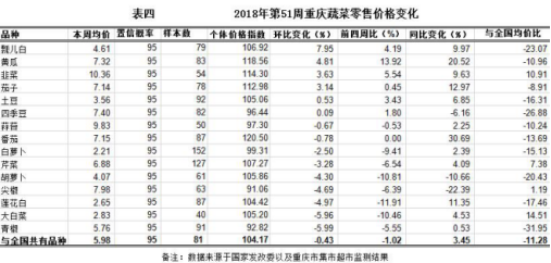 第51周重庆市38个区县农贸市场15个蔬菜监测品种零售均价5.98元/公斤,类价格指数104.14,环比下滑0.43%,与前四周比下滑1.02%,均表现平稳;同比略涨3.45%;明显低于全国11.28%。分品种环比看,4涨8跌4平稳。具体表现,环比上涨的品种及价格变化:瓢儿白4.61元/公斤,个体价格指数106.92,环比上涨7.95%;黄瓜7.32元/公斤,个体价格指数118.56,环比小幅上涨4.81%;韭菜10.36元/公斤,个体价格指数114.30,环比略涨3.63%;茄子7.14元/公斤,个体价格指数112.98,环比略涨3.14%。环比下跌的品种及价格变化:青椒5.76元/公斤,个体价格指数92.82,环比小幅下跌5.99%;大白菜2.83元/公斤,个体价格指数105.20,环比小幅下跌5.96%;莲花白2.65元/公斤,个体价格指数104.42,环比小幅下跌4.97%;尖椒7.98元/公斤,个体价格指数91.06,环比小幅下跌4.69%;胡萝卜4.07元/公斤,个体价格指数105.86,环比小幅下跌4.69%;芹菜6.88元/公斤,个体价格指数107.27,环比略跌3.28%;白萝卜2.21元/公斤,个体价格指数99.31,环比略跌2.50%。其余品种价格均表现平稳(详见表四)。