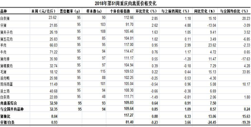 市农业信息中心对全市38个区县农贸市场13个主要肉禽蛋品种监测,第51周重庆市肉禽蛋均价32.50元/公斤,类价格指数为109.03。环比,4涨1跌8平稳,总体上浮0.64%,表现平稳,11个共有品种均价与全国持平。