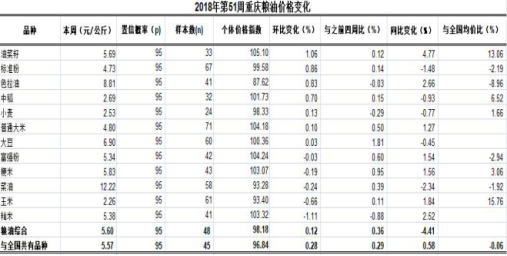 根据市农业信息中心对全市38个区县农贸市场12个主要粮油品种价格监测,第51周重庆粮油总体均价5.60元/公斤,类价格指数为98.18。环比,1涨1跌10平稳,总体上浮0.12%,表现平稳,9个共有品种均价与全国持平。