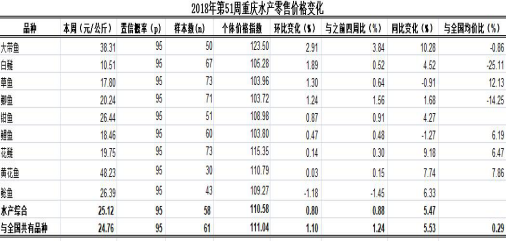 根据市农业信息中心对全市38个区县农贸市场9种主要水产品(除大带鱼、黄花鱼为冻鱼,其余品种均为活鱼)零售价格监测,第51周重庆水产总体零售均价25.12元/公斤,类价格指数为110.58。环比,4涨1跌4平稳,总体上浮0.80%,表现平稳,6个共有品种均价与全国持平。