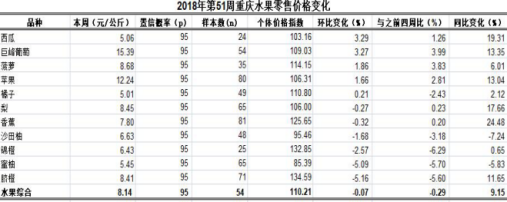 根据市农业信息中心对全市38个区县农贸市场11种大众、时令水果监测,第51周重庆水果总体零售均价8.14元/公斤,类价格指数110.21。环比,2涨3跌6平稳,总体下滑0.07%,表现平稳。