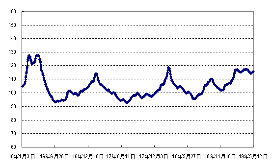 据农业农村部监测,2019年第19周(2019年5月6日- 5月12日,下同)“农产品批发价格200指数”为115.46(以2015年为100),比前一周升0.83个点;“‘菜篮子’产品批发价格200指数”为117.49(以2015年为100),比前一周升0.94个点。重点监测的50家批发市场60个品种交易总量为55.08万吨,比前一周增6.4%。