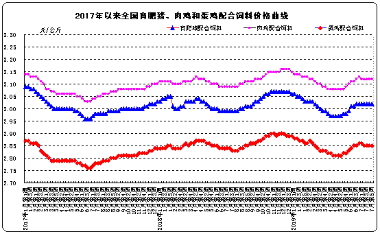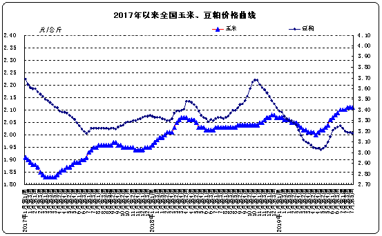 饲料价格。全国玉米平均价格2.11元/公斤,与上周价格持平,同比上涨3.9%。主产区东北三省玉米平均价格为1.87元/公斤,与上周价格持平;主销区广东省玉米价格2.23元/公斤,比前一周上涨0.5%。全国豆粕平均价格3.18元/公斤,比前一周下降0.3%,同比下降4.5%。育肥猪配合饲料平均价格3.02元/公斤,与上周价格持平,同比上涨1.0%;肉鸡配合饲料平均价格3.12元/公斤,与上周价格持平,同比上涨1.0%;蛋鸡配合饲料平均价格2.85元/公斤,与上周价格持平,同比上涨0.7%。