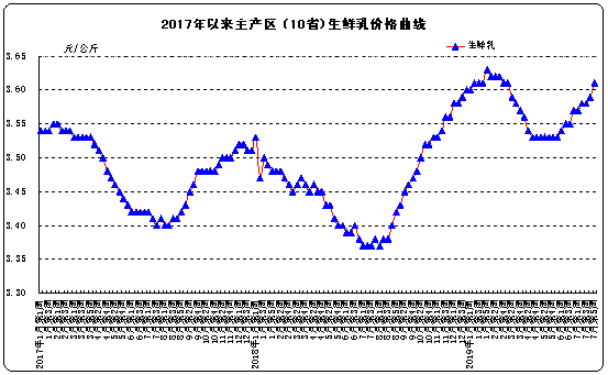 生鲜乳价格。内蒙古、河北等10个奶牛主产省(区)生鲜乳平均价格3.61元/公斤,比前一周上涨0.6%,同比上涨7.1%。