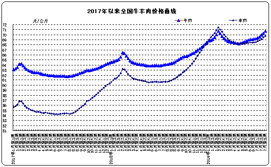 牛羊价格。全国牛肉平均价格70.70元/公斤,比前一周上涨0.5%,同比上涨10.2%。河北、辽宁、吉林、山东和河南等主产省份牛肉平均价格63.55元/公斤,比前一周上涨0.3%;上海、浙江、福建、广东和江苏等非主产省份平均价格83.77元/公斤,比前一周上涨0.3%。全国羊肉平均价格69.76元/公斤,比前一周上涨0.4%,同比上涨14.9%。河北、内蒙古、山东、河南和新疆等主产省份羊肉平均价格67.85元/公斤,比前一周上涨0.3%;上海、浙江、福建、江西和广东等非主产省份平均价格72.72元/公斤,比前一周上涨0.3%。