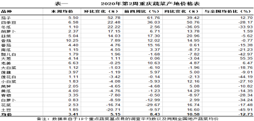 2020年第2周(2019.01.06~2020.01.12)重庆市21个主要产地蔬菜监测品种均价3.41元(公斤价,以下无特别说明同),环比小幅上涨5.15%,与前四周比上涨8.43%,与去年同期比(以下简称“同比”)明显上涨10.58%,明显低于全国均价12.73%。分品种环比看,8涨8跌5平稳。环比上涨幅度较大的品种及价格变化:茄子5.50元,环比陡升52.78%;四季豆6.58元、冬瓜1.10元,环比分别大幅上涨22.48%、22.22%;胡萝卜2.37元、韭菜5.04元,环比分别明显上涨17.15%、14.03%。环比下跌幅度较大的品种及价格变化:土豆1.85元,环比大幅下跌20.71%;花菜2.53元,环比明显下跌16.74%。其余品种涨跌幅均在10.00%以内(详见表一)。