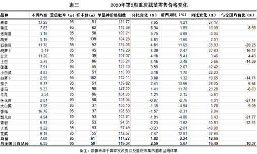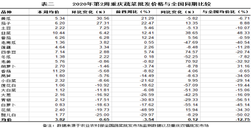 与全国同期、同品种监测结果比较,以双福国际农贸城蔬菜批发市场批发价格做分析,第2周重庆21个蔬菜品种算数平均批发价3.82元,环比上浮0.65%、表现平稳,与前四周比略跌3.54%,同比上浮0.12%、表现平稳,明显低于全国均价12.75%。分品种环比看,9涨10跌2平稳。具体表现,环比上涨幅度较大的品种及价格变化:黄瓜5.34元,环比陡升30.56%;茄子6.20元,环比大幅上涨27.31%。环比下跌幅度较大的品种及价格变化:瓢儿白1.77元,环比大幅下跌25.00%;花菜2.40元、白萝卜0.83元、青椒2.12元、大葱2.16元、大白菜1.12元、莲花白1.06元,环比分别明显下跌19.73%、18.63%、17.51%、16.92%、11.81%、10.92%。其余品种涨跌幅均在10.00%以内(详见表二)。