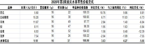 根据市农业信息中心对全市38个区县农贸市场6种大众、时令水果监测,第2周重庆水果总体零售均价9.18元,类价格指数100.90。环比,3涨1跌2平稳,环比略涨3.63%。