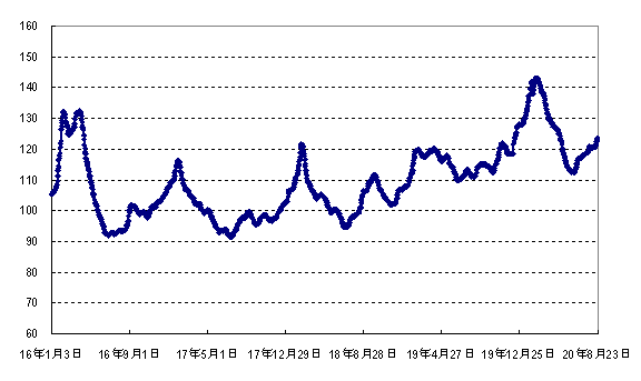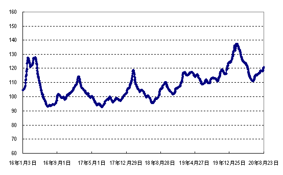 据农业农村部监测,2020年第34周(2020年8月17日—2020年8月23日,下同)“农产品批发价格200指数”为120.01(以2015年为100),比前一周升1.72个点;“‘菜篮子’产品批发价格200指数”为122.59(以2015年为100),比前一周升2.00个点。