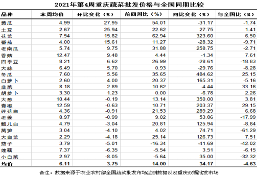 第4周双福国际农贸城蔬菜批发量环比略减2.46%,同比陡升54.85%。与全国同期、同品种监测结果比较,以双福国际农贸城蔬菜批发市场批发价做分析,重庆22个蔬菜品种平均批发价6.11元,环比略涨3.75%,与前四周比明显上涨14.00%,同比陡升34.17%,小幅低于全国4.63%。分品种环比看,11涨6跌5平稳。其中,上涨幅度较大的品种及价格变化:黄瓜4.99元、土豆2.67元,环比分别大幅上涨27.95%、25.94%;花菜7.54元、番茄4.00元,环比分别明显上涨15.82%、15.61%。其余品种涨跌幅均在10.00%以内。