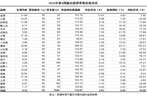 第4周重庆市38个区县农贸市场22个蔬菜监测品种零售均价9.12元,类价格指数135.07,环比略涨2.63%,与前四周比上涨9.29%,同比明显上涨16.69%。分品种环比看,12涨1跌9平稳。具体表现,上涨幅度较大的品种及价格变化:韭菜11.06元,单品种价格指数101.75,环比明显上涨11.61%;大蒜10.44元,单品种价格指数114.32,环比上涨9.98%;四季豆11.08元,单品种价格指数117.84,环比上涨8.18%;瓢儿白6.71元,单品种价格指数145.17,环比上涨7.91%;冬瓜6.26元,单品种价格指数100.24,环比上涨7.50%;老南瓜5.93元,单品种价格指数175.86,环比上涨7.35%;大葱17.16元,单品种价格指数175.78,环比上涨6.52%。下跌幅度较大的品种及价格变化:番茄7.17元,单品种价格指数125.82,环比小幅下跌5.05%。其余品种涨跌幅度较小。