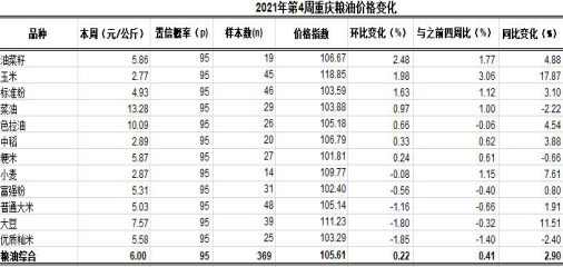 根据市农业信息中心对全市38个区县农贸市场12个主要粮油品种价格监测,第4周重庆粮油总体均价6.00元,类价格指数为105.61。环比,3涨3跌6平稳,总体上浮0.22%、表现平稳。